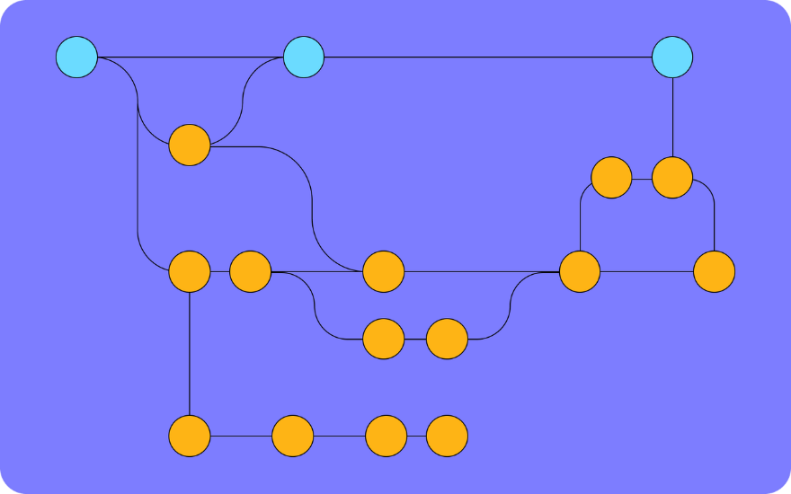 Визуально ветки можно представить в таком виде. Линия с голубыми кружками — основной проект. Остальные — ветки и ответвления, которые периодически сливаются или остаются в стороне, если этого требует разработка