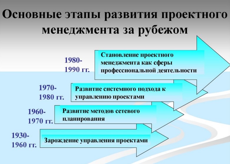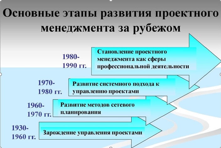 Однако история развития проектного менеджмента как дисциплины относительно молода: ее относят к 30-м годам ХХ века и связывают с разработкой специальных методов координации инжиниринга крупных проектов в США авиационных в «US Air Corporation» и нефтегазовых в фирме «Ехоп».